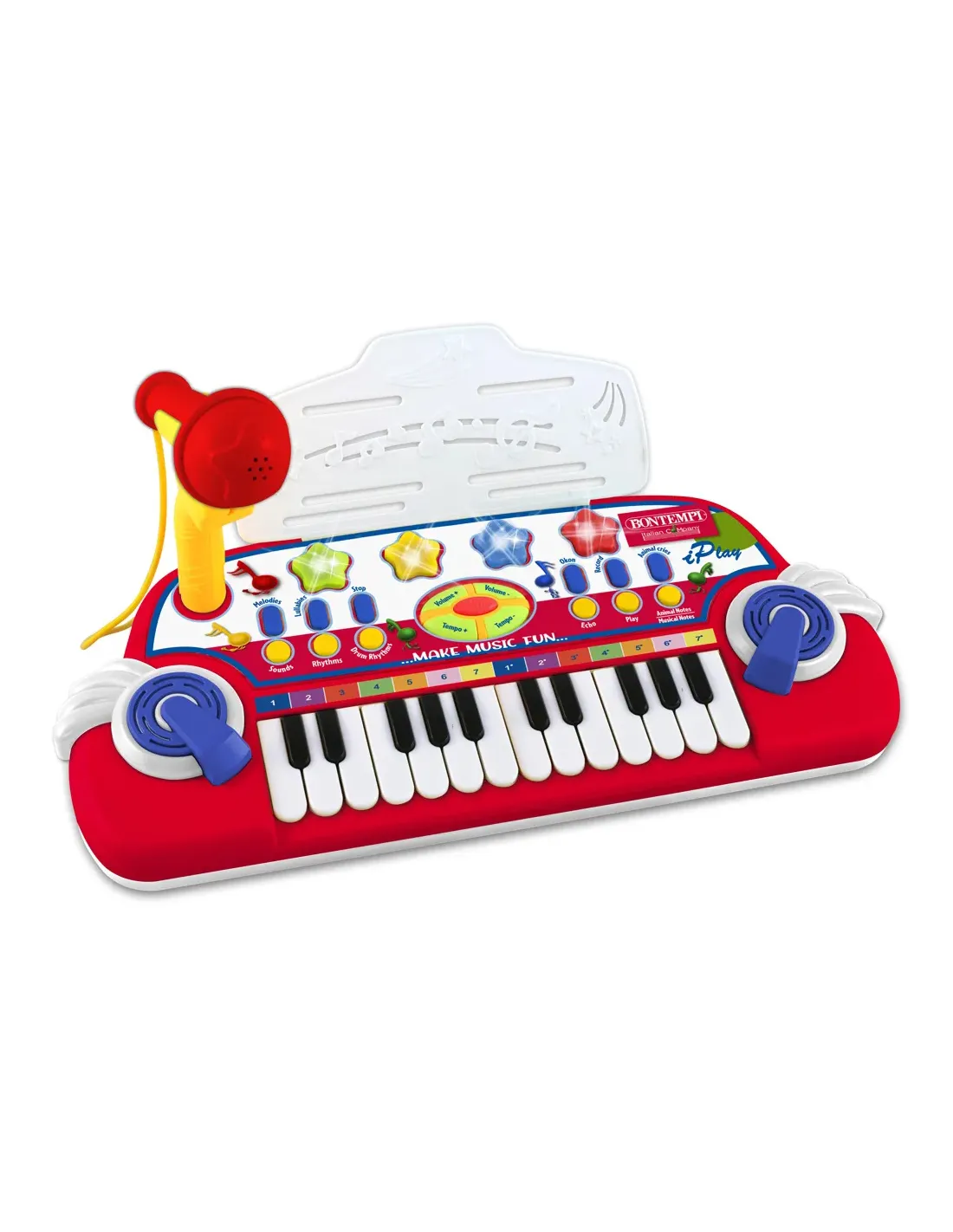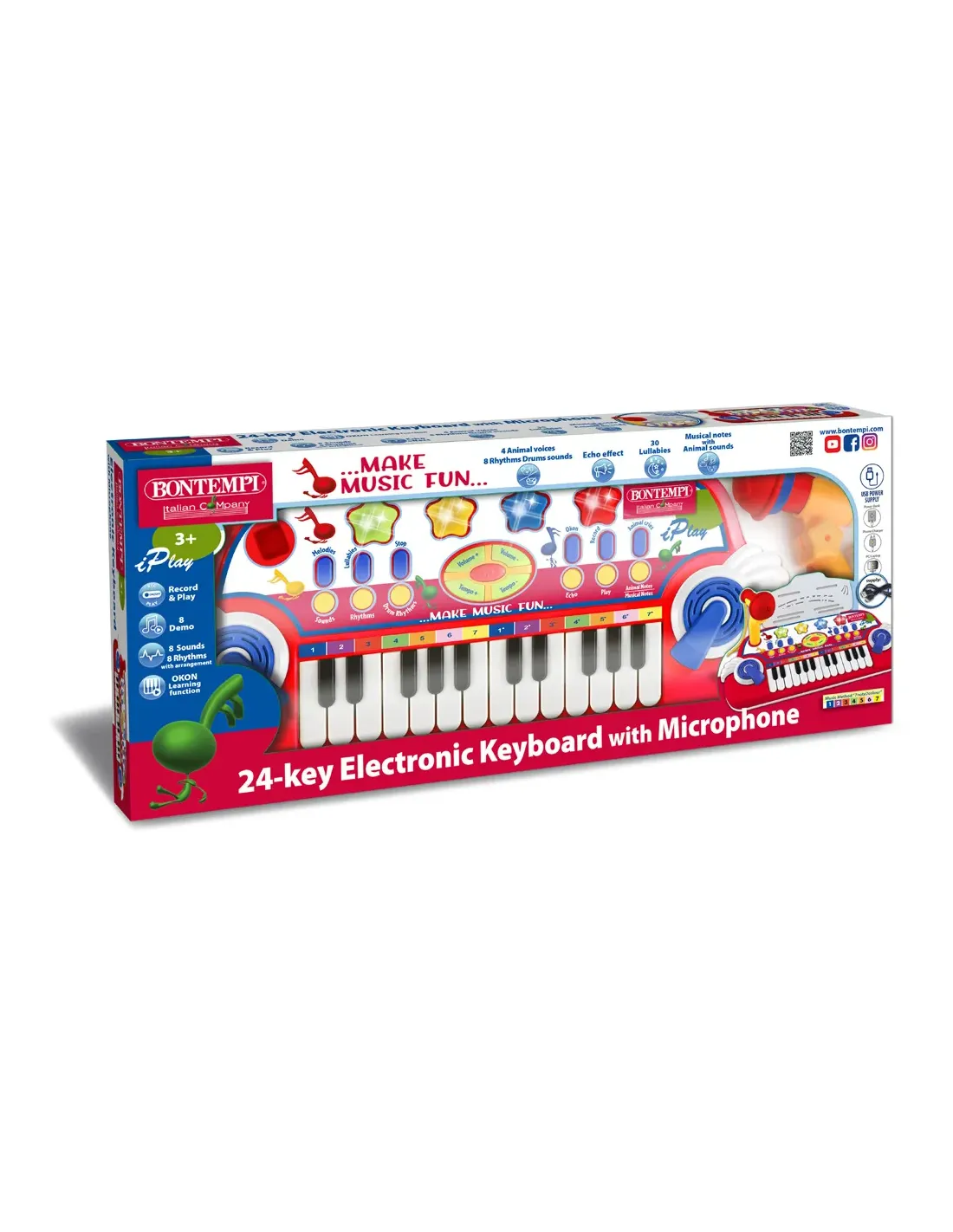 Tastiera elettronica a 24 tasti con: microfono, 4 pads, 4 suoni, 4 ritmi, 6 brani preregistrati, regolazione volume e tempo ed effetti luminosi..