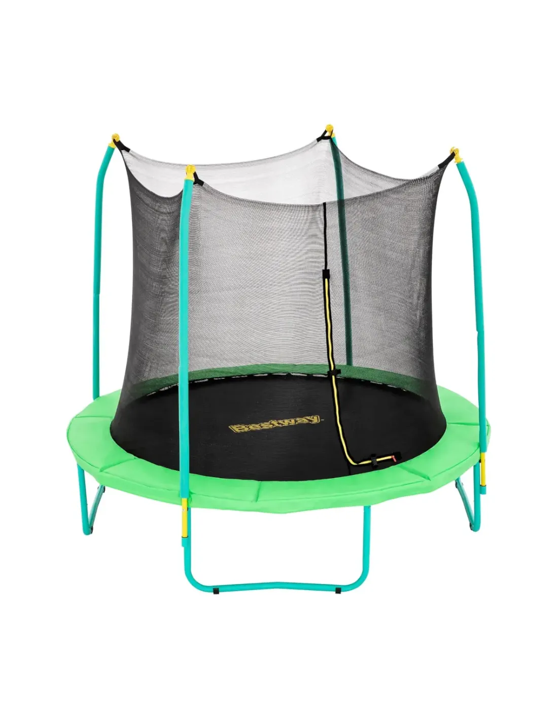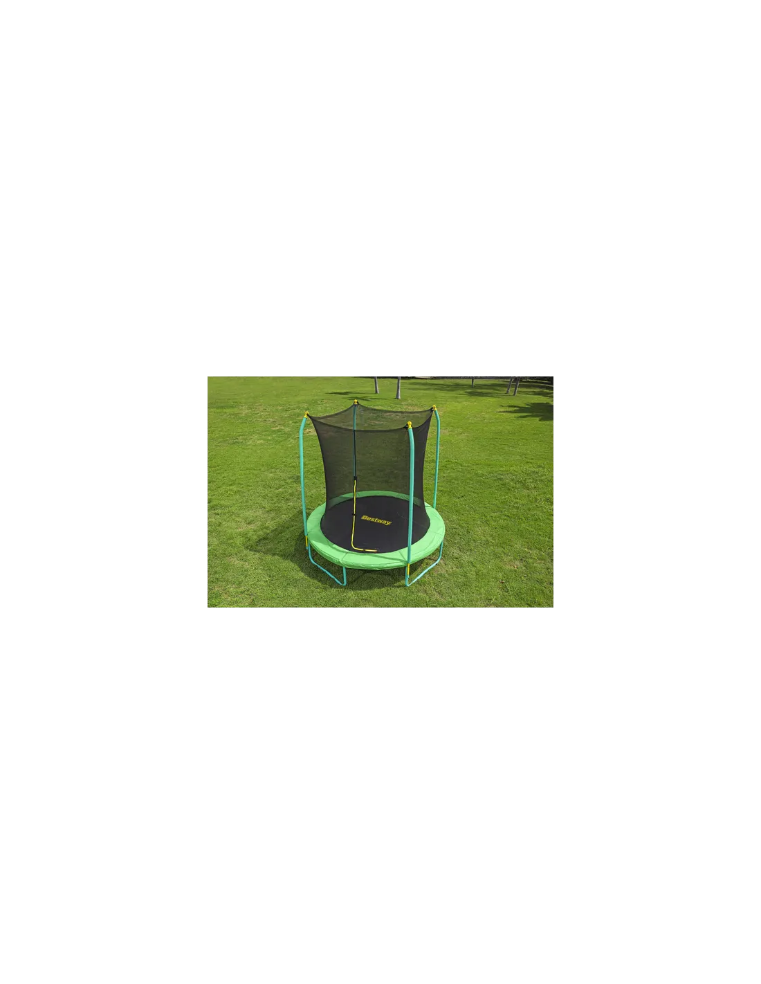Trampolino dal diametro di 244 cm con rete di protezione dotata di apertura a cerniera e scaletta per l’accesso al trampolino incluse; altezza del trampolino: 60 cm, altezza della rete di protezione: 154 cm e portata massima: 50 kg.